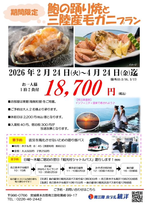 【鮑の踊り焼と三陸産毛ガニを味わう贅沢温泉宿泊プラン】